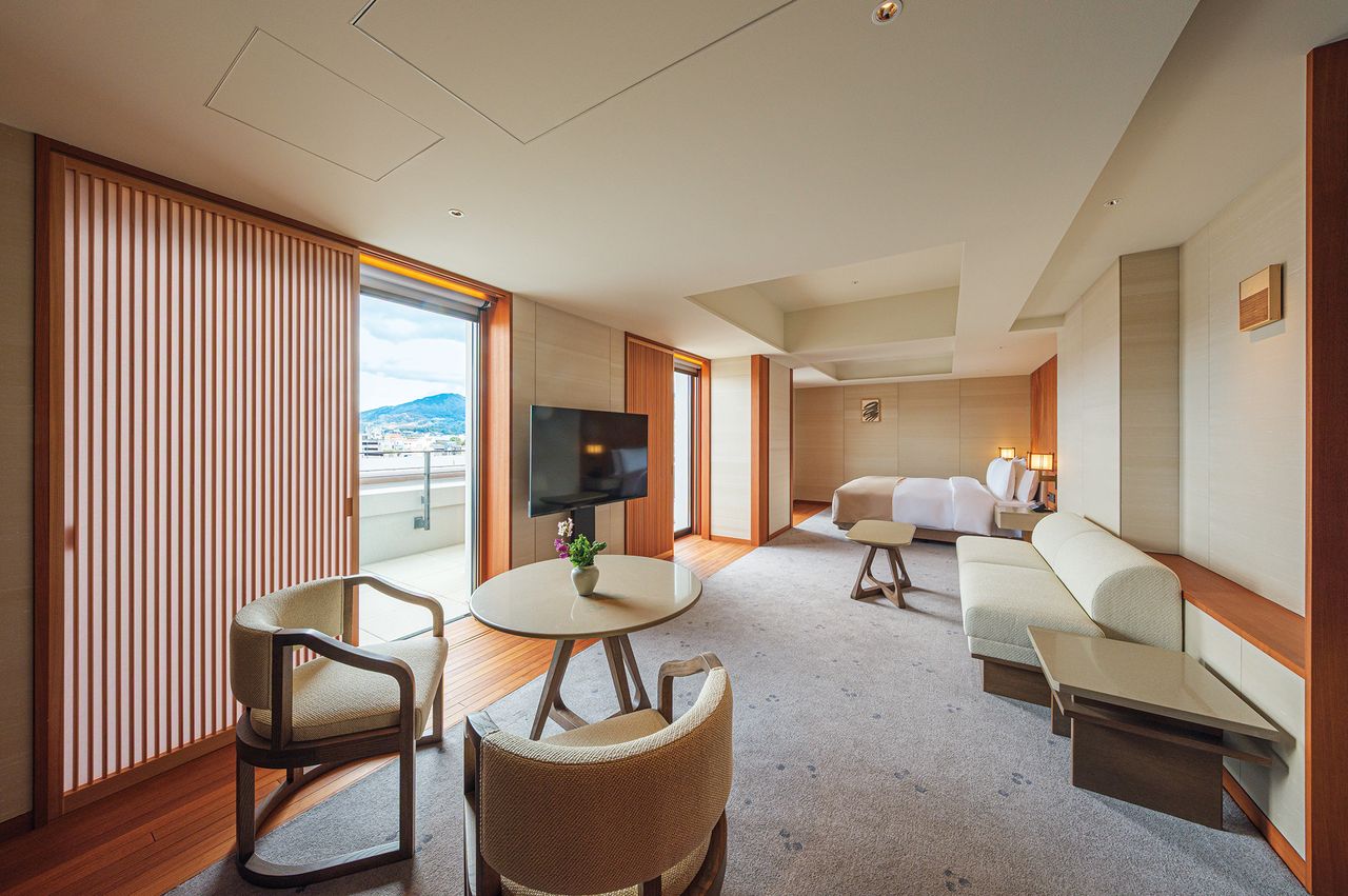 The Kyoto Imperial Hotel features 55 guest rooms and suites, each offering different vistas. What connects them is their common heritage and the design elements that highlight regional materials, including cedar headboards, soft silk wall coverings, zelkova wood shelves, and bedside lamps that resemble traditional Japanese lanterns. Certain suites contain framed artifacts from the Yasakai Kaikan.