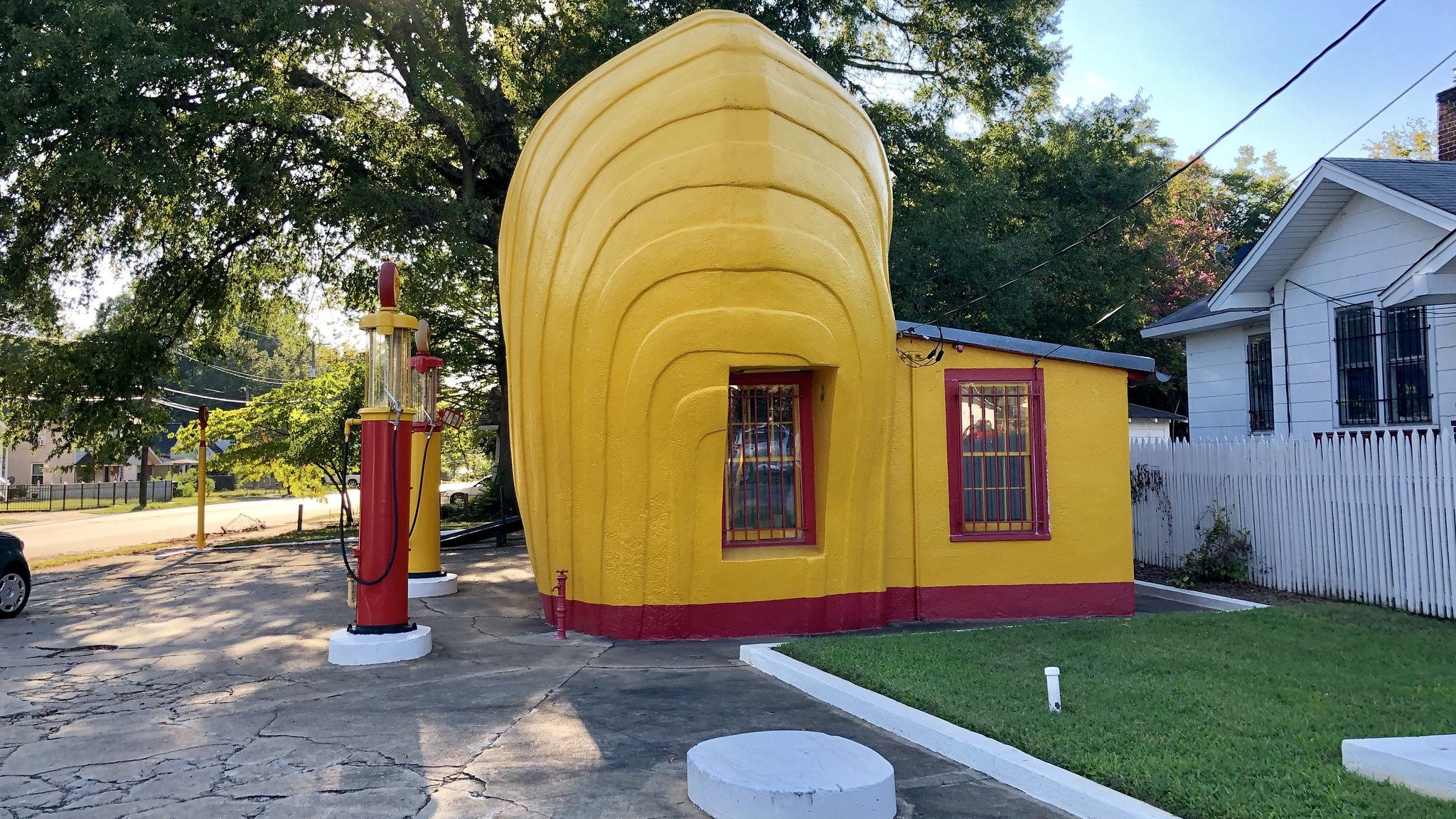 Located on E. Sprague Street in Winston-Salem, the Seashell Gas Station is impossible to miss. Its bright yellow color and distinctive shell-like shape make it a standout among other buildings. This whimsical structure is more than just an eye-catching design—it’s a piece of history that brings a smile to anyone who sees it.