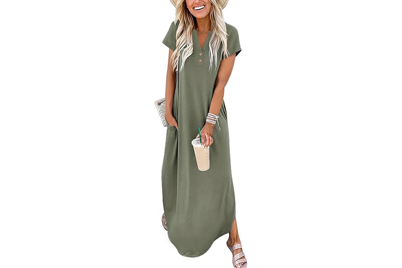 This throw-it-on-and-go maxi dress is one you’ll end up wearing way more than you planned. The loose, stretchy fit is comfortable enough for all-day sightseeing yet still looks pulled together for dinner reservations. It packs down small, doesn’t hog suitcase space, and pairs effortlessly with sneakers, sandals, or even heels. The best part? It has pockets!