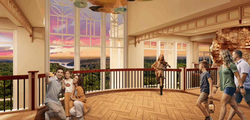 The resort will offer door-to-door transportation to Silver Dollar City and include amenities like fire pits, landscaping, and an outdoor pool. The lobby area will be inspired by Marvel Cave, with stonework and lanterns, while a nearly four-story window will frame the stunning views of the Ozarks and Table Rock Lake.