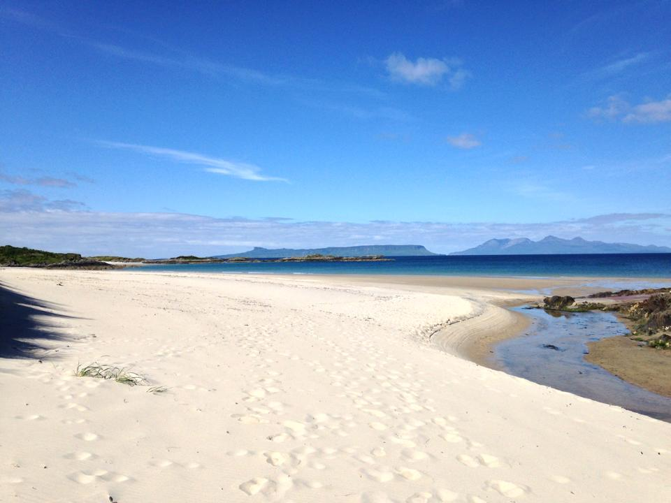 It provides a calming contrast to the millennia of volcanic activity that surrounds it. Visible from its cool silver sands are the Hebrides islands of Rum, Eigg, and Muck, all several miles offshore.